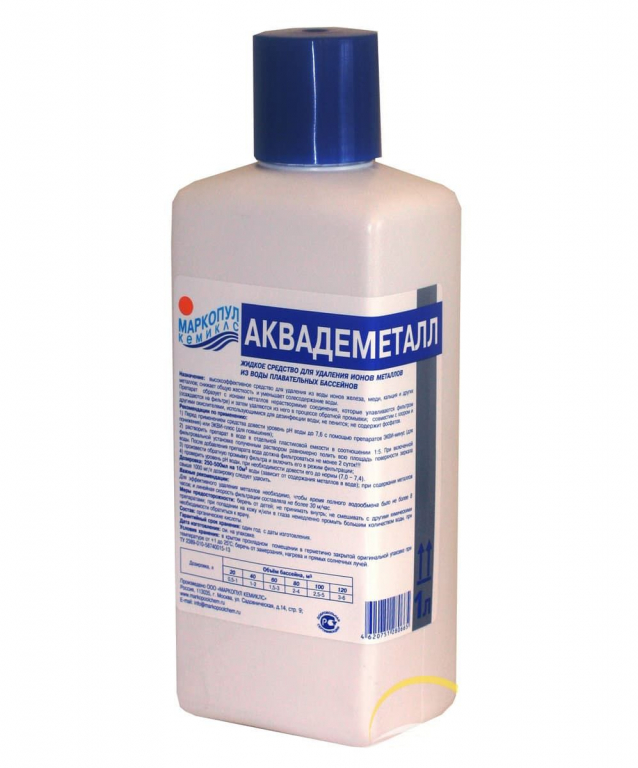 кальция и др. Значительно снижает общий процент жесткости и уменьшает содержание солей в воде. Препарат Аквадеметалл образует с ионами металлов нерастворимые соединения, которые осаждаются на фильтре и впоследствии удаляются из него способом обратной промывки. Средство создано на основе органической кислоты. Совместимо с хлором и другими окислителями, которые используются для дезинфекции воды. Не пенится, не содержит фосфатов.